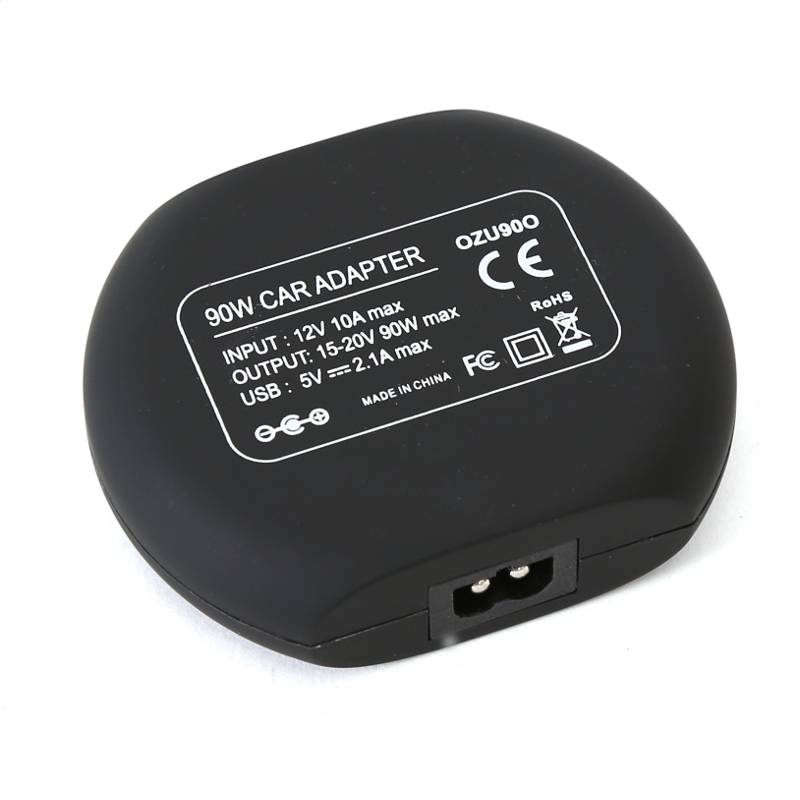 90W universal automatic car adapter for notebooks and ultrabooks with 2.1A USB charging port.