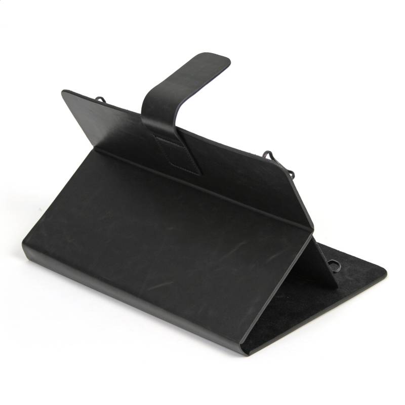 Etui na tablet do wielkości 7"-7,85" (pasuje również na Ipad mini), w kolorze czarnym. Ekoskórzane, bardzo eleganckie, solidne. Tablet mocowany na plastikowe, czarne uchwyty regulowane elastyczna gumką.