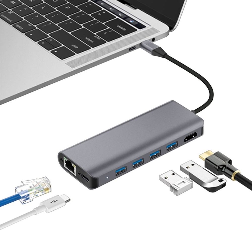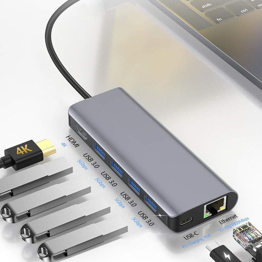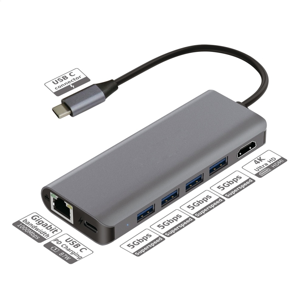 7 connectors (USB Type-C output, Gigabit Ethernet, USB Type-C input, 4 USB 3.0 ports, HDMI port)
