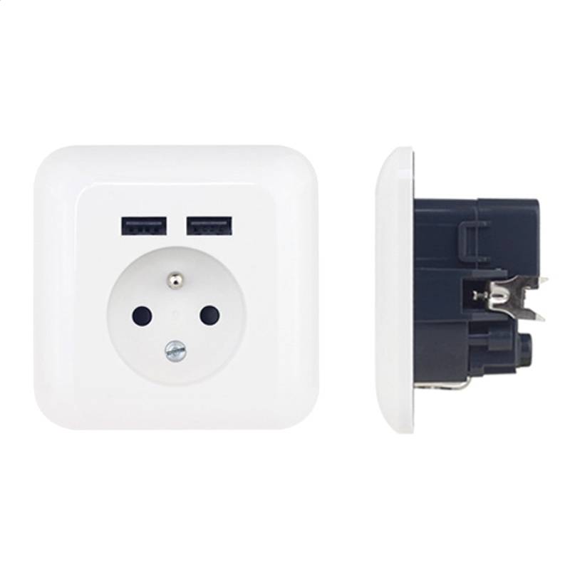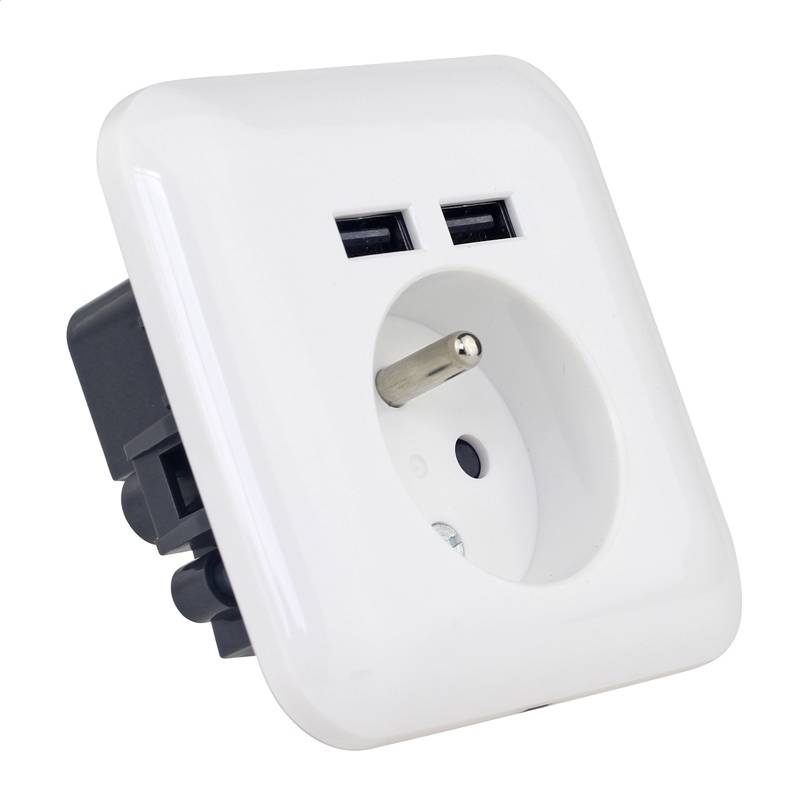 Wall socket (Ref PWSF2U) "French type" equipped with two USB ports for connection of two additional devices. This is a simple but very useful product that will allow you to charge all types of phones, tablets and other rechargeable devices via a USB port. Thus, it is possible to simultaneously charge 2 USB devices.
