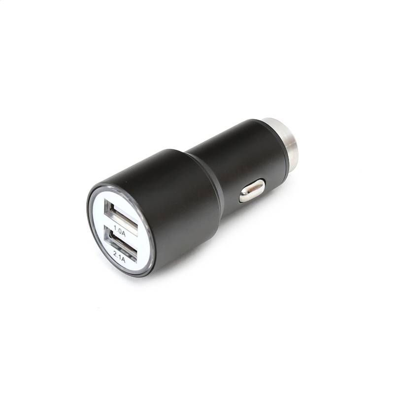 Small size USB car charger with 2 USB ports and total output 2.1A.