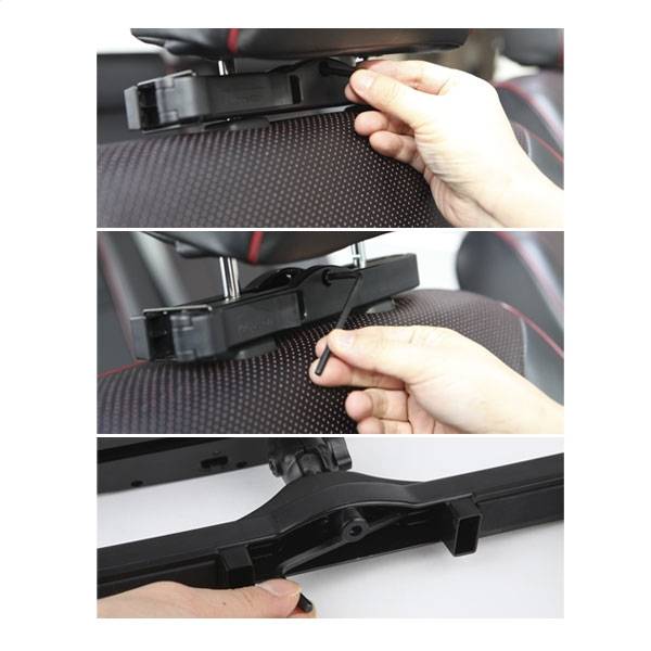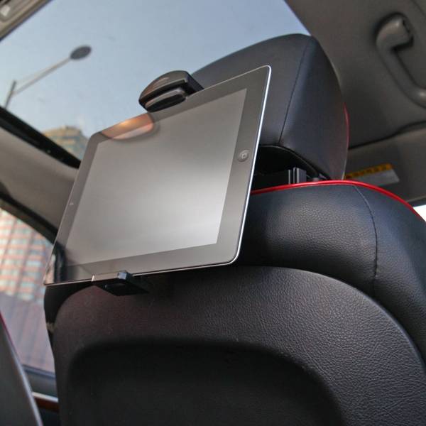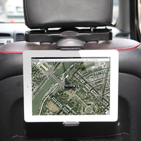 Porte-tablette universel Discovery, avec un systeme de fixation innovant sur l'appui-tete, assurant une maintenance solide de l'appareil pendant la conduite.