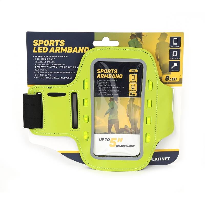 Brassard pour smartphones de taille jusqu'a 5". Le produit dispose de 8 LEDs pour améliorer votre visibilité pendant la nuit. Puissance 2 x piles CR2032 (incluses). Le produit est doté d'un matériau en PU réfléchissant améliorant votre visibilité la nuit tombée.