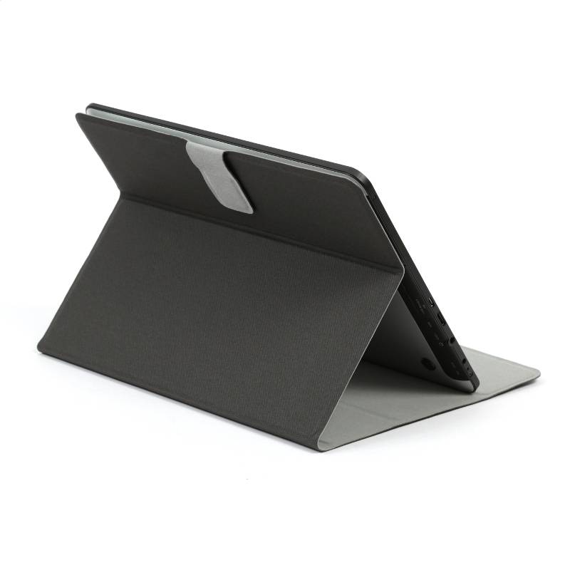 Une bande avec un adhésif a l'intérieur fournit un ajustement parfait et une protection de la tablette. A l'intérieur il y a une doublure douce en microfibre. L'étui est fermée avec une bande extérieure avec un logo en relief.