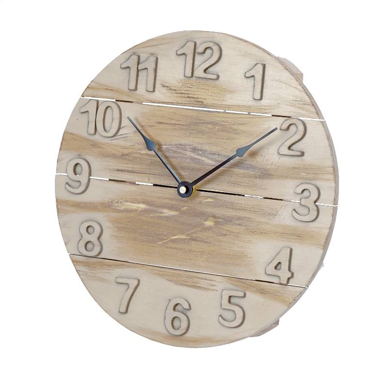 MAY wall clock is a construction with a large, clear shield placed on a wooden texture.
